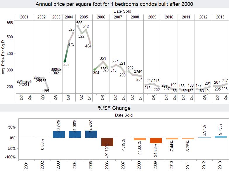 After the market bottomed out in 2011, prices increased by 3.97% in 2012. This increase was higher in 2013 at 9.75%. However, remember that this graph represents a broad look at the market. In 2012, prices were increasing dramatically in the most popular buildings. In 2013, the rest of the market was starting to follow this trend with a slight delay. Also, all sales are specific to certain buildings and floor plans. Two distinct one bedroom floor plans in the same building often have very different sale prices. This contrast is also evident by building. One bedroom floor plans at Calypso will sell in the mid-200s while other buildings are only selling in the mid-100s.