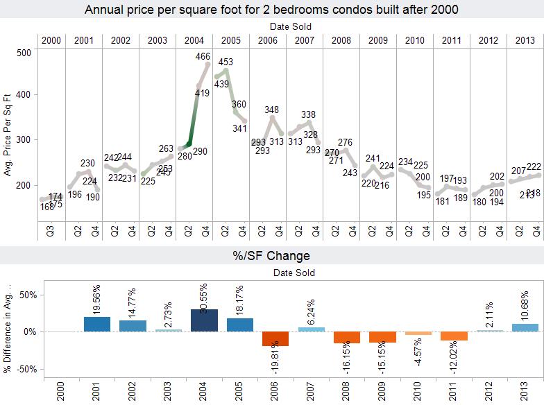 The increase for two bedroom condos in 2012 was more modest at 2.11%. However, in 2013, these prices jumped by 10.68%. Again, this graph shows a broad overview, and prices were variable depending on the floor plan and building in question.