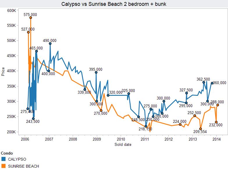 Last year, we shared a graph that depicted the differences in sales at Calypso and Sunrise Beach. Clearly, Sunrise Beach did experience the price increase I predicted at that time. Both floor plans saw continued prices increase throughout 2013. While some of the dips look low, they are not as dramatic as they seem. After all, when you consider the cost of furnishing and small renovations in a foreclosed unit, the cost basis is usually about $30,000 to $40,000.