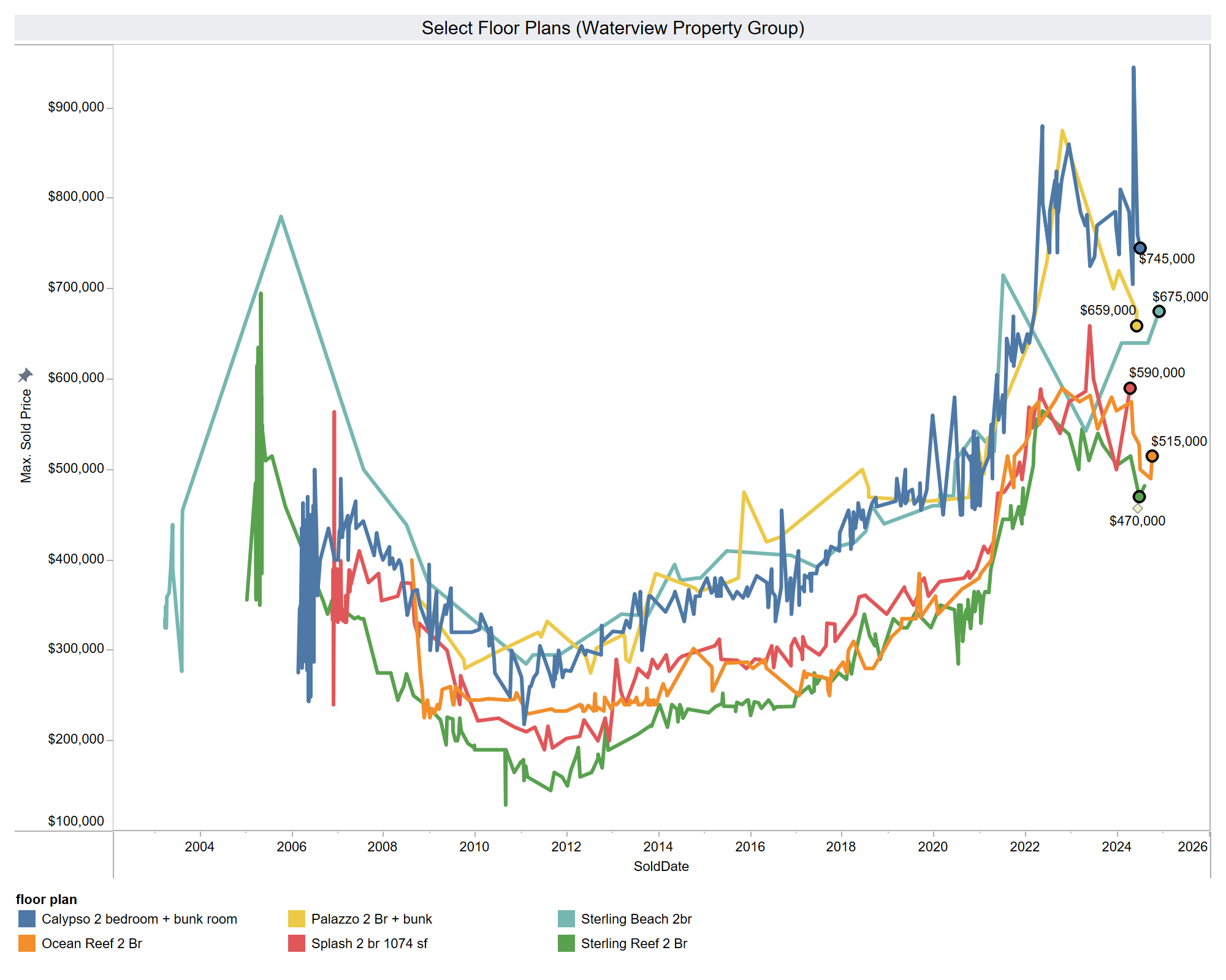Some buildings and specific floor plans have maintained their value, showing resilience against market pressures. For example, Calypso's two bedroom plus bunk floor plan has consistently sold within the range of 705k to 810k, with the most recent sale of unit 2-204 at 745k. Sterling Beach Condominium's two-bedroom floor plan actually increased in price from 2023 to 2024.