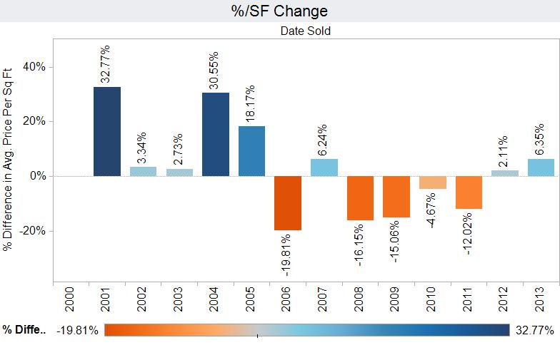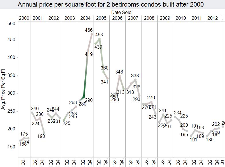 Historical look at the per square foot price of two bedroom condos built after 2000
