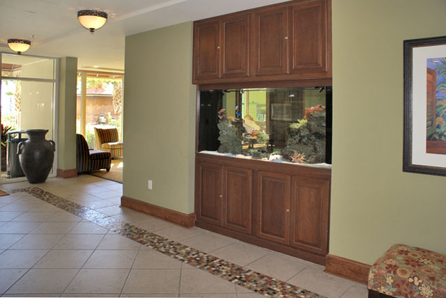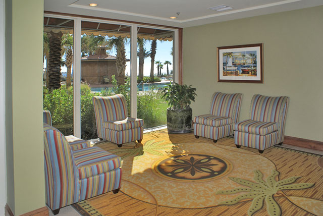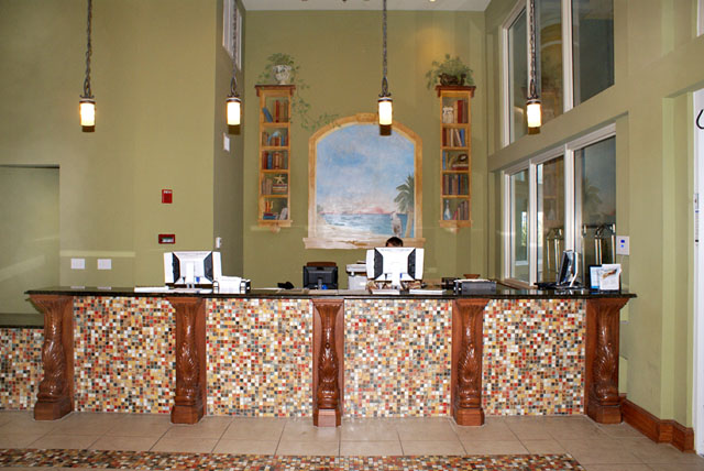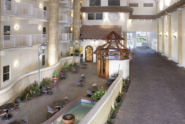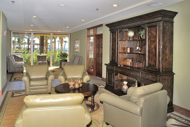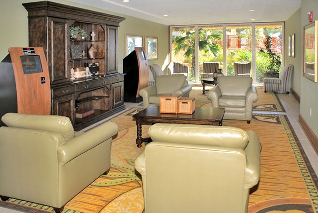 The development also has an indoor heated swimming pool, a full-service spa, fitness center and an onsite market. The large lobby provides an onsite check-in desk and is next to the open air receiving area with fountains and a sitting area. Keeping with the Mediterranean-inspired decor, there are pineapple willies near the lobby.